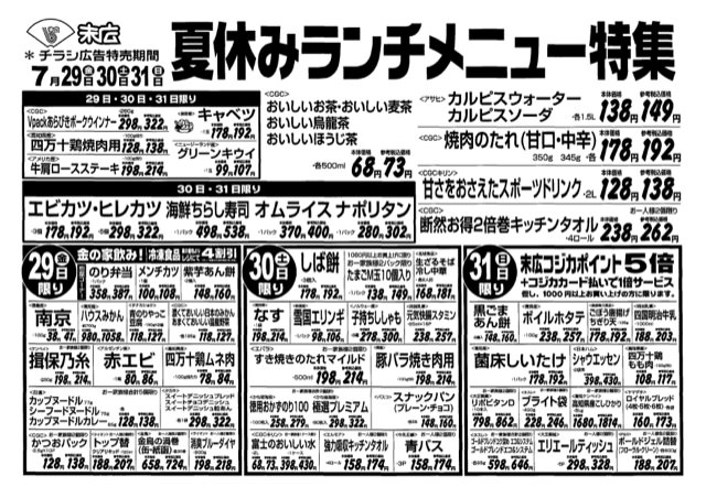 【末広チラシ情報】ネットでチラシを確認できます。 7月29日から7月31日のチラシは「夏休みランチメニュー特集!四万十鶏焼肉用138円」 https://www.suehiloya.com/public/1A7a3.pdf pdf(213kB) -