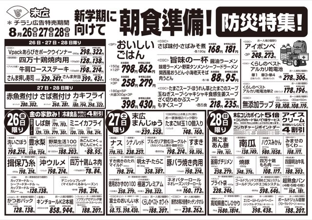 【末広チラシ情報】ネットでチラシを確認できます。 8月26日から8月28日のチラシは「新学期に向けて朝食準備!Vpackあらびきポークウインナー322円」 http://ow.ly/yrJr50KpVFe 簡易版jpg(119kB)、 http://ow.ly/qnXg50KpVFb 詳細版pdf(2.3MB) -