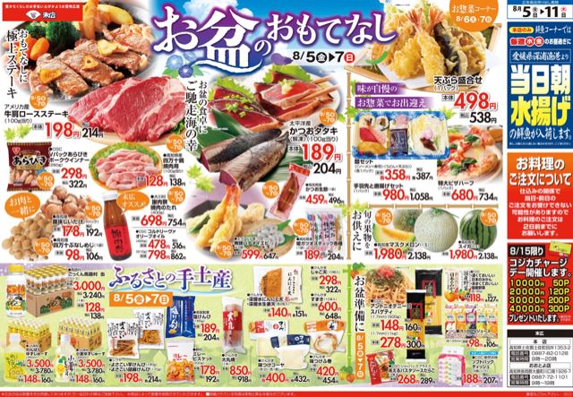 8月5日から8月11日のチラシは「お盆のおもてなし。牛肩ロースステーキ214円」