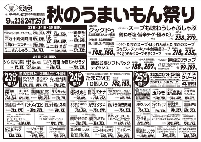 9月23日から9月25日のチラシは「秋のうまいもん祭り。おはぎ259円」