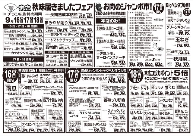 9月16日から9月18日のチラシは「秋味届きましたフェア。塩サンマ215円」