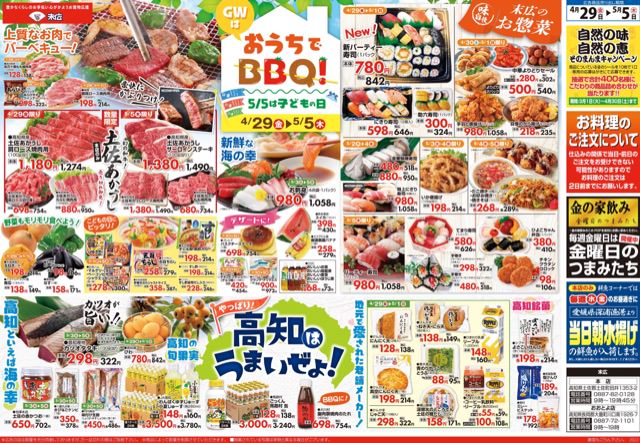 4月29日から5月5日のチラシは「GWはおうちでBBQ!土佐あかうし肩ロース焼肉用1,274円」