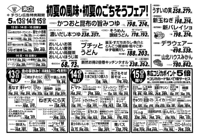 【末広チラシ情報】ネットでチラシを確認できます。 5月13日から5月15日のチラシは「初夏の風味・初夏のごちそうフェア!そうめん192円」 https://www.suehiloya.com/public/1riU0.pdf pdf(291kB) -