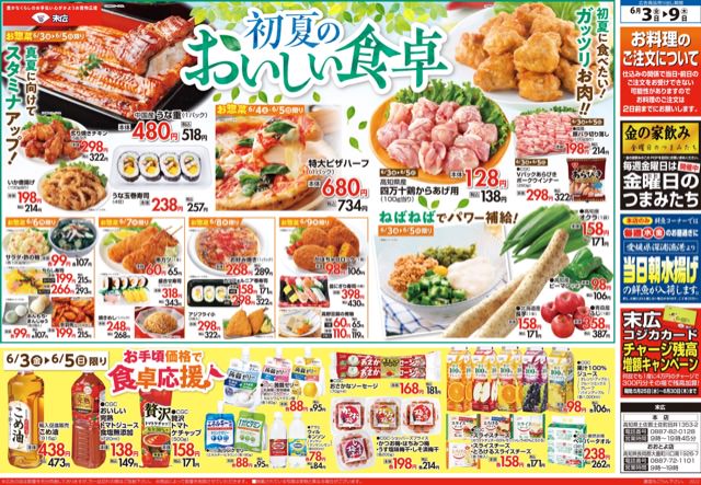 【末広チラシ情報】ネットでチラシを確認できます。 6月3日から6月9日のチラシは「初夏のおいしい食卓。うな重518円」 http://ow.ly/EsWG50JnJn0 簡易版jpg(111kB)、 http://ow.ly/QjIa50JnJn1 詳細版pdf(5.3MB) -