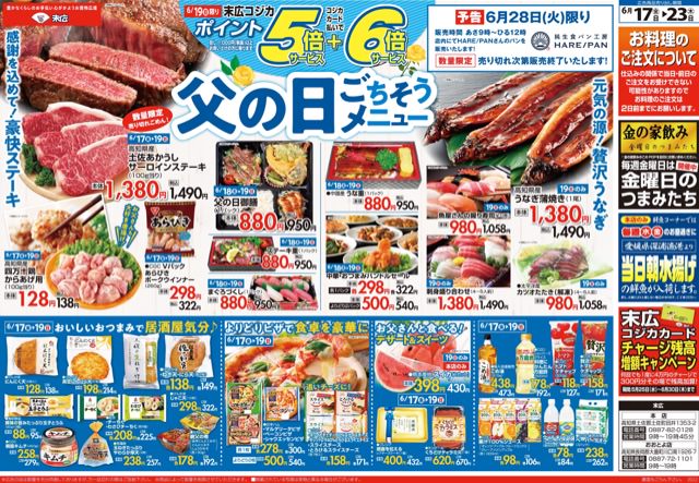 6月17日から6月23日のチラシは「父の日ごちそうメニュー。土佐あかうしサーロインステーキ1,490円」