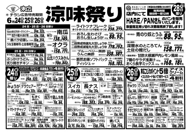 【末広チラシ情報】ネットでチラシを確認できます。 6月24日から6月26日のチラシは「涼味祭り。うな玉巻寿司257円」 https://www.suehiloya.com/public/t3T42.pdf pdf(291kB) -