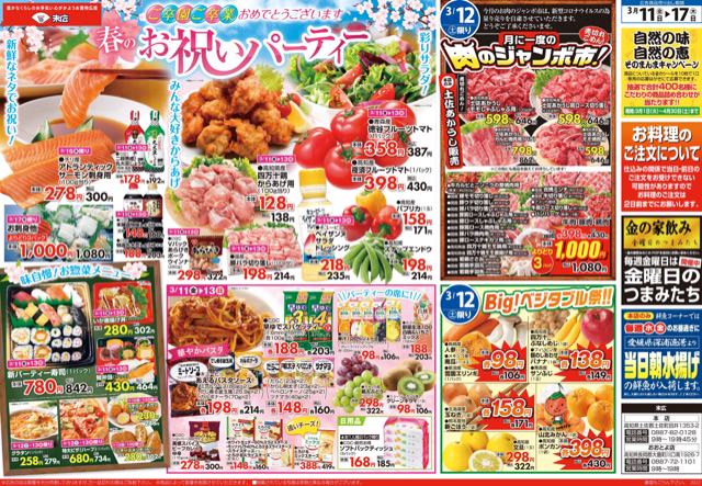 3月11日から3月17日のチラシは「ご卒園ご卒業おめでとうございます。春のお祝いパーティー。お刺身他よりどり3パック1,080円」