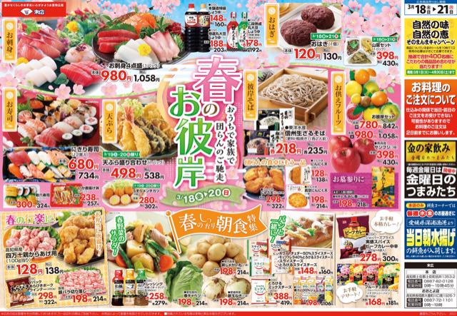 3月18日から3月20日のチラシは「おうちで家族で団らんのご馳走。春のお彼岸。おはぎ130円」
