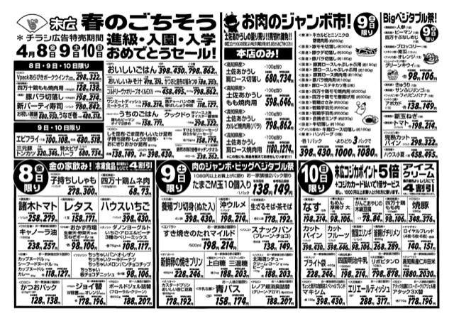 【末広チラシ情報】ネットでチラシを確認できます。 4月15日から4月17日のチラシは「食卓応援価セール!豚バラ切落し214円」 https://www.suehiloya.com/public/O7dX9.pdf pdf(238kB) -