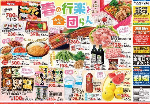 4月22日から4月24日のチラシは「春の行楽とおうちDE団らん。うな重646円」