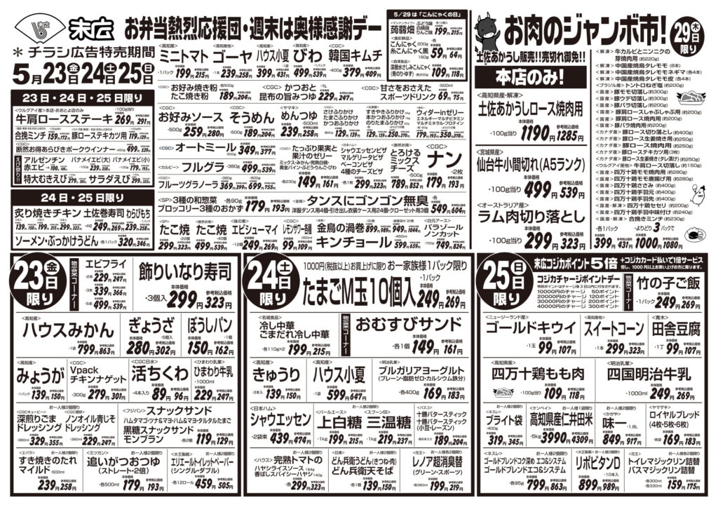 【末広チラシ情報】ネットでチラシを確認できます。 5月23日~5月29日のチラシは「お弁当熱烈応援団 牛肩ロースステーキ 291円」 詳細版PDFはこちら(1.5MB) -