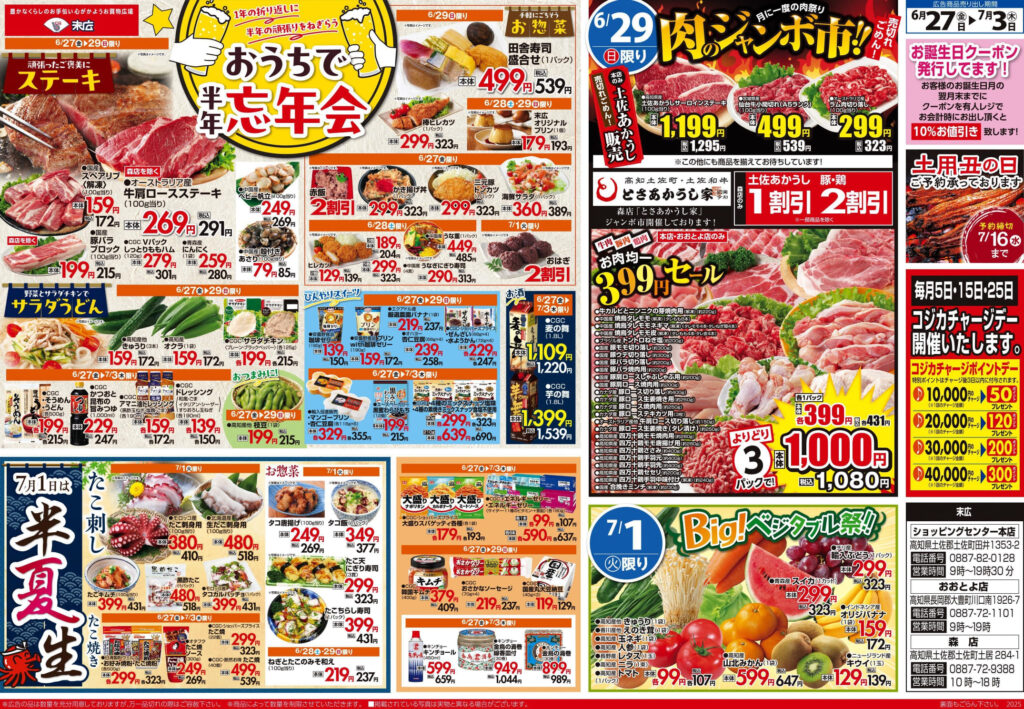 【末広チラシ情報】ネットでチラシを確認できます。 6月27日~7月3日のチラシは「おうちで半年忘年会 牛肩ロースステーキ 291円」 詳細版PDFはこちら(1.5MB) -
