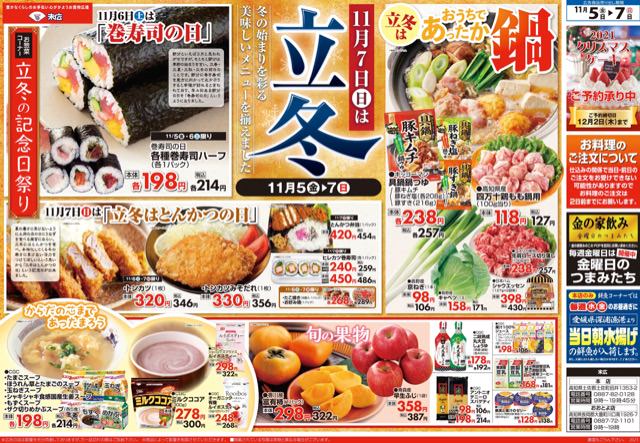 11月5日から11月7日のチラシは「11月7日は立冬。冬の始まりを彩る美味しいメニューを揃えました。トンカツ346円」