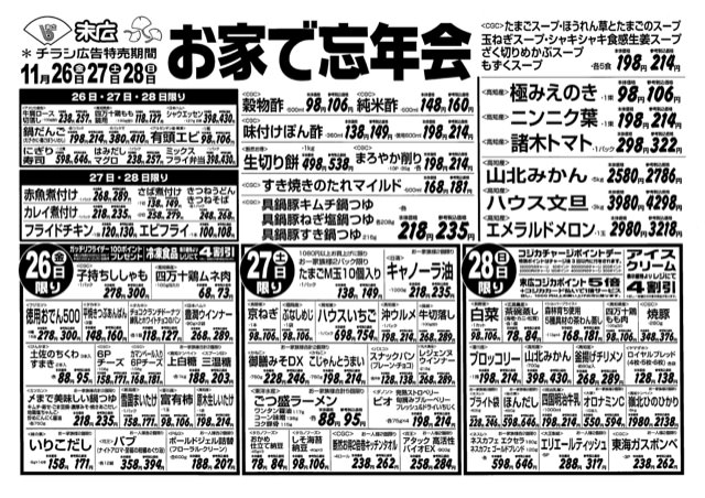 【末広チラシ情報】ネットでチラシを確認できます。 11月26日から11月28日のチラシは「お家で忘年会。鍋だんご214円」 http://ow.ly/k8Y550GTXQH pdf(303kB) -