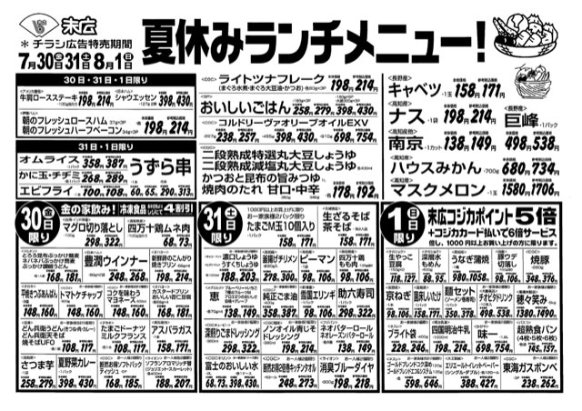 【末広チラシ情報】ネットでチラシを確認できます。 7月30日から8月1日のチラシは「夏休みランチメニュー!焼肉のたれ192円」 https://www.suehiloya.com/public/7U34q.pdf pdf(291kB) -