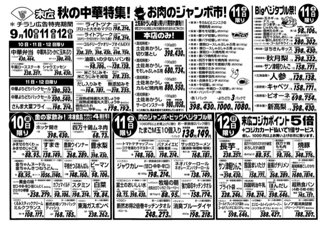 9月10日から9月12日のチラシは「秋の中華特集!中華弁当464円」