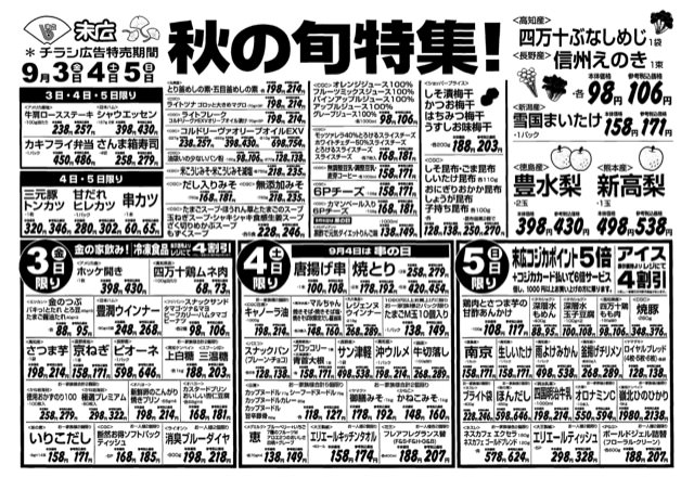 【末広チラシ情報】ネットでチラシを確認できます。 9月17日から9月23日のチラシは「秋の味覚。お彼岸のおもてなしにもぴったり!おはぎ108円」 http://ow.ly/BUFb50Ga2OJ 簡易版jpg(102kB)、 http://ow.ly/xHnv50Ga2OK 詳細版pdf(5.1MB) -