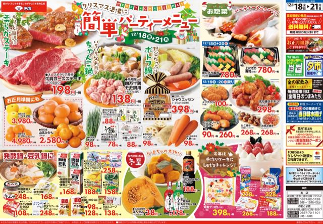 12月18日から12月21日のチラシは「クリスマス準備に簡単パーティーメニュー。四万十鶏モモ鍋用138円」