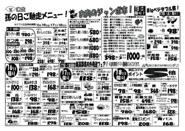 10月16日から10月18日のチラシは「孫の日ごちそうメニュー。新パーティー寿司780円」