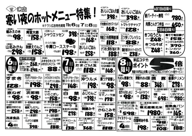 11月6日から11月8日のチラシは「寒い夜のホットメニュー特集!鍋つゆ168円」