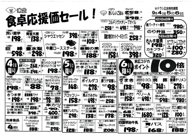 9月11日から9月13日のチラシは「秋のごちそうセール。バレイショ98円」