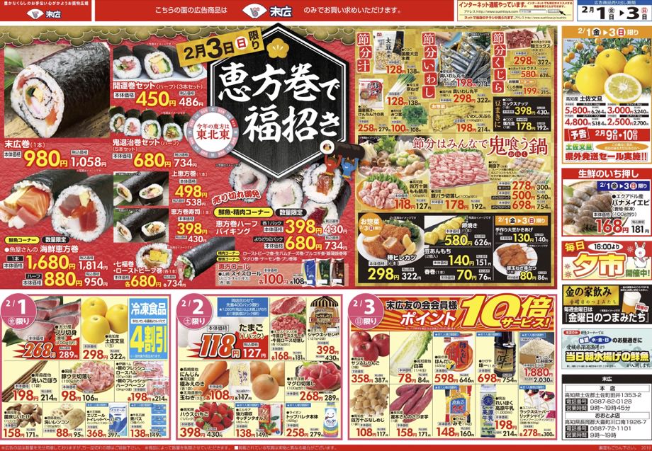 2月1日から2月3日のチラシは「恵方巻で福招き。開運巻セットハーフ3本セット450円」