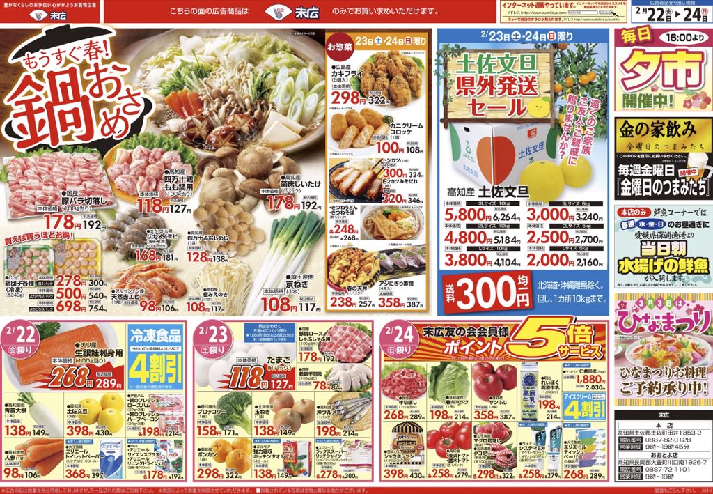 2月22日から2月24日のチラシは「もうすぐ春!鍋おさめ。四万十鶏モモ鍋用118円」