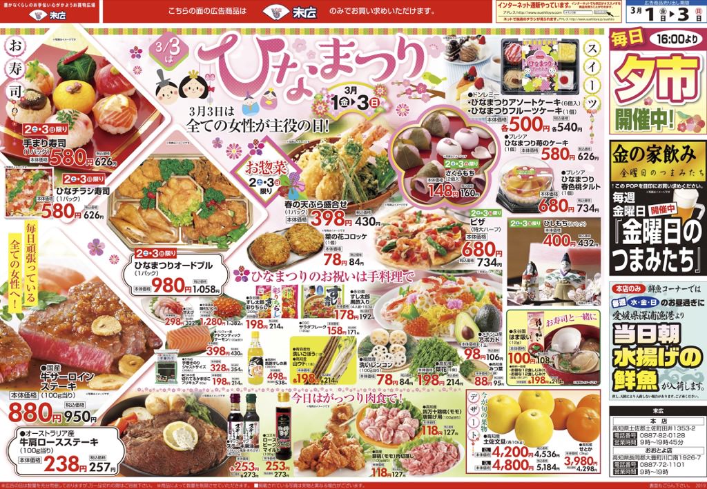 3月1日から3月3日のチラシは「3月3日はひなまつり。手まり寿司580円」