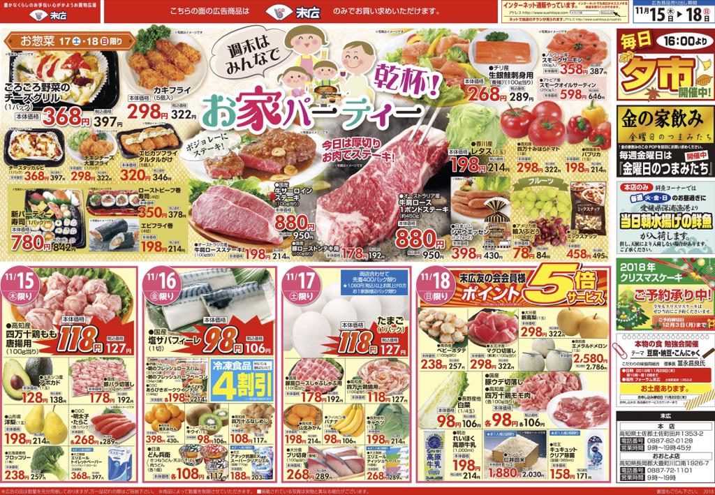【末広チラシ情報】ネットでチラシを確認できます。 11月15日から11月18日のチラシは「乾杯!週末はみんなででお家パーティー。ころごろ野菜のチーズグリル368円」 http://ow.ly/yyUm30mCzuY 簡易版jpg(233kB)、 http://ow.ly/WFSg30mCzqV 詳細版pdf(5.1MB) -