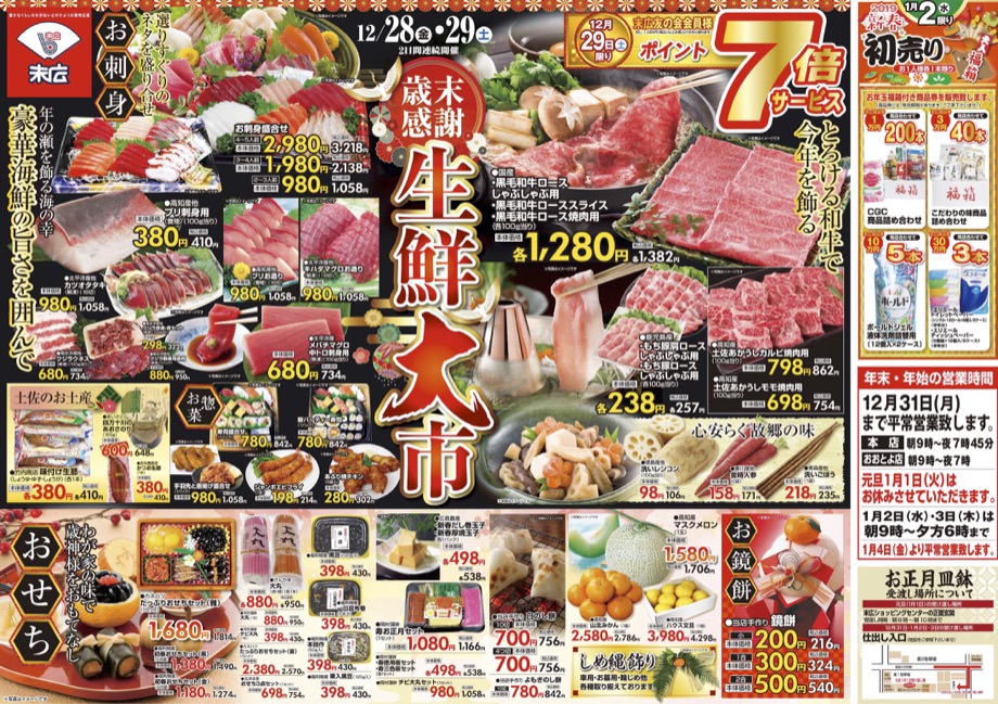 12月28日から12月29日のチラシは「歳末感謝生鮮大市。お刺身盛り合わせ2,980円」