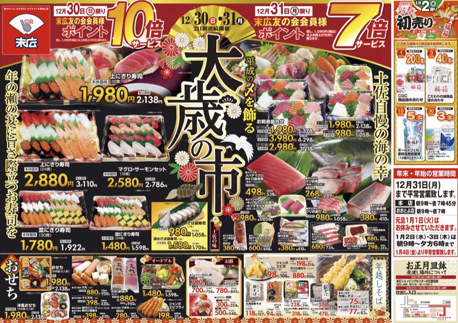 【末広チラシ情報】ネットでチラシを確認できます。 12月30日から12月31日のチラシは「大歳の市。上にぎり寿司1,980円」 http://ow.ly/upx430n7spY 簡易版jpg(180kB)、 http://ow.ly/uN8430n7spn 詳細版pdf(4.7MB) -