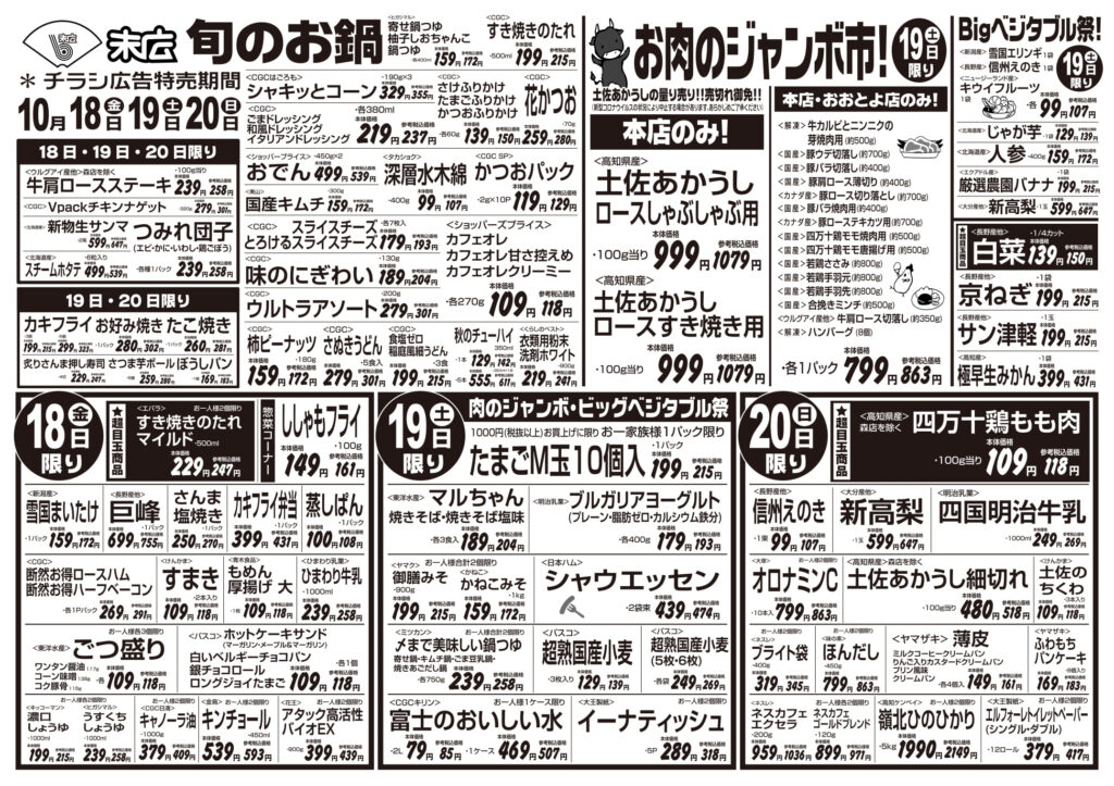 【末広チラシ情報】ネットでチラシを確認できます。 10月18日~10月24日のチラシは「Bigベジタブル祭! 白菜 150円」 詳細版PDFはこちら(1.5MB) -
