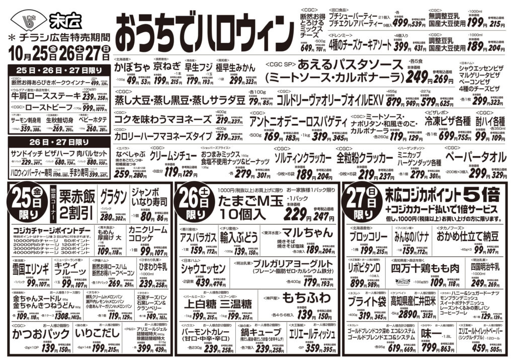 【末広チラシ情報】ネットでチラシを確認できます。 10月25日~10月31日のチラシは「おうちでハロウィン サーモン刺身用388円」 詳細版PDFはこちら(1.5MB) -