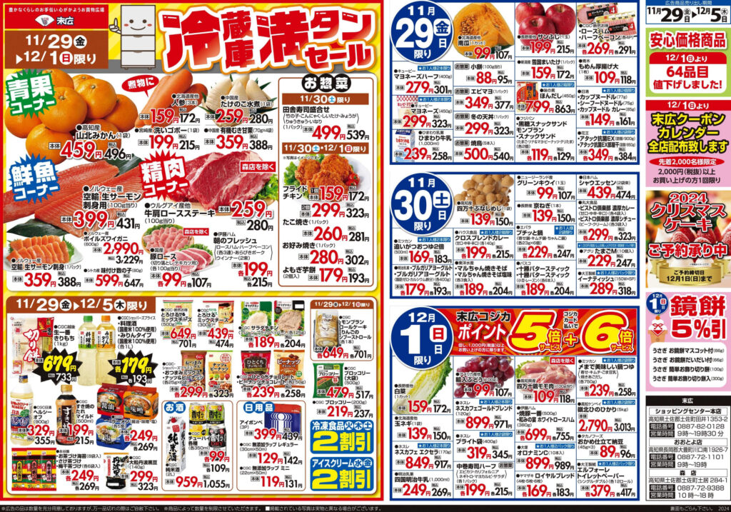 【末広チラシ情報】ネットでチラシを確認できます。 11月29日~12月5日のチラシは「冷蔵庫満タンセール 山北みかん(1袋) 496円」 詳細版PDFはこちら(1.5MB) -