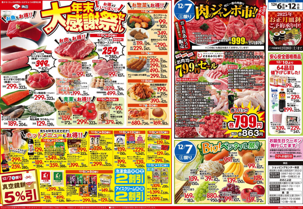 12月6日~12月12日のチラシは「年末大感謝祭セール キハダまぐろ刺身用 431円」