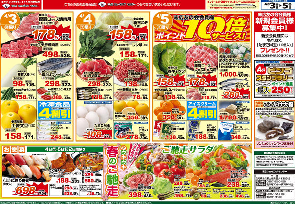 【末広チラシ情報】ネットでチラシを確認できます。 今日のチラシは「心ウキウキ春のごちそう。高知産トマト298円」 http://ow.ly/L0fVK 簡易版jpg(153kB)、 http://ow.ly/L0fIP 詳細版pdf(3.5MB) -