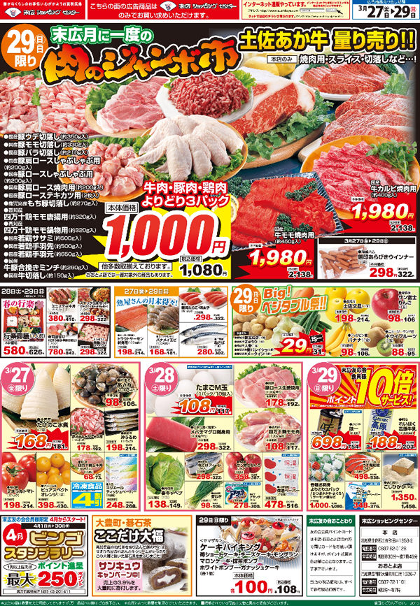 今日のチラシは「末広月に一度の肉のジャンボ市。牛肉・豚肉・鶏肉よりどり3パック1,000円」