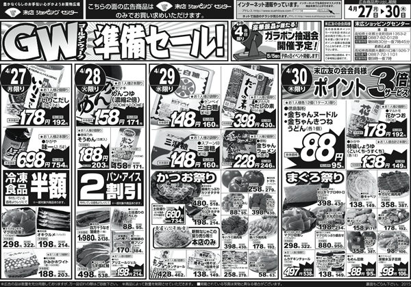 今日のチラシは「GW準備セール。4月27日〜30日まで日替わり特価」