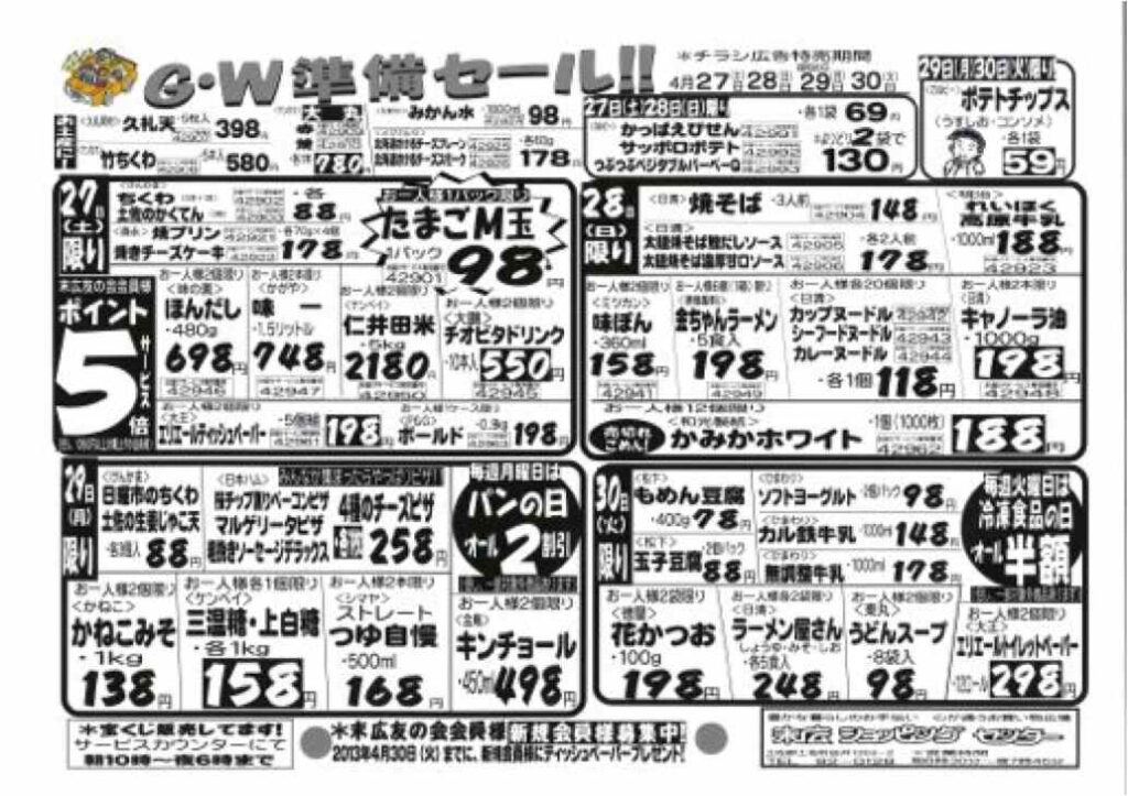【末広チラシ情報】ネットでチラシを確認できます。 今日のチラシは「GW準備セール。カルビーポテトチップス59円」 http://ow.ly/koFbc 簡易版pdf(159kB)、 http://ow.ly/koF8x 詳細版pdf(4.6MB) -
