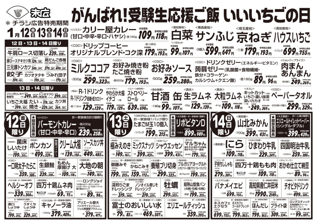 【末広チラシ情報】ネットでチラシを確認できます。 1月12日~1月18日のチラシは「いいいちごの日 ハウスいちご(1パック)755円」 詳細版PDFはこちら(1.4MB) -