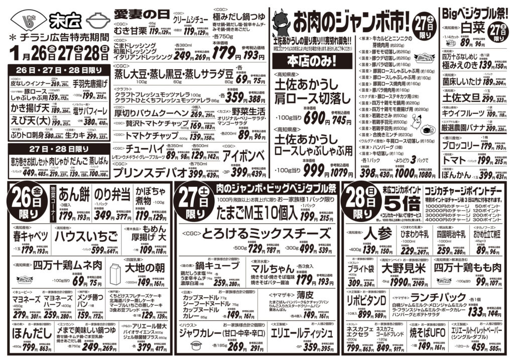 【末広チラシ情報】ネットでチラシを確認できます。 1月26日~2月1日のチラシは「お肉のジャンボ市! よりどり3パック 1,080円」 詳細版PDFはこちら(1.3MB) -