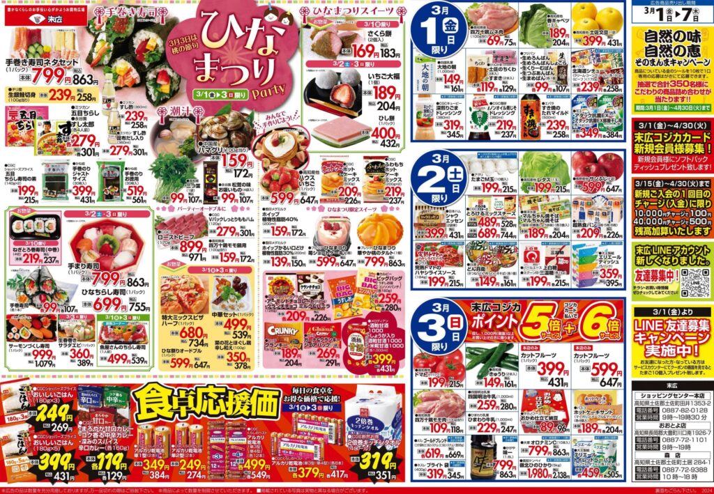 【末広チラシ情報】ネットでチラシを確認できます。 3月1日~3月7日のチラシは「ひなまつりParty 手巻き寿司ネタセット 863円」 詳細版PDFはこちら(1.5MB) -