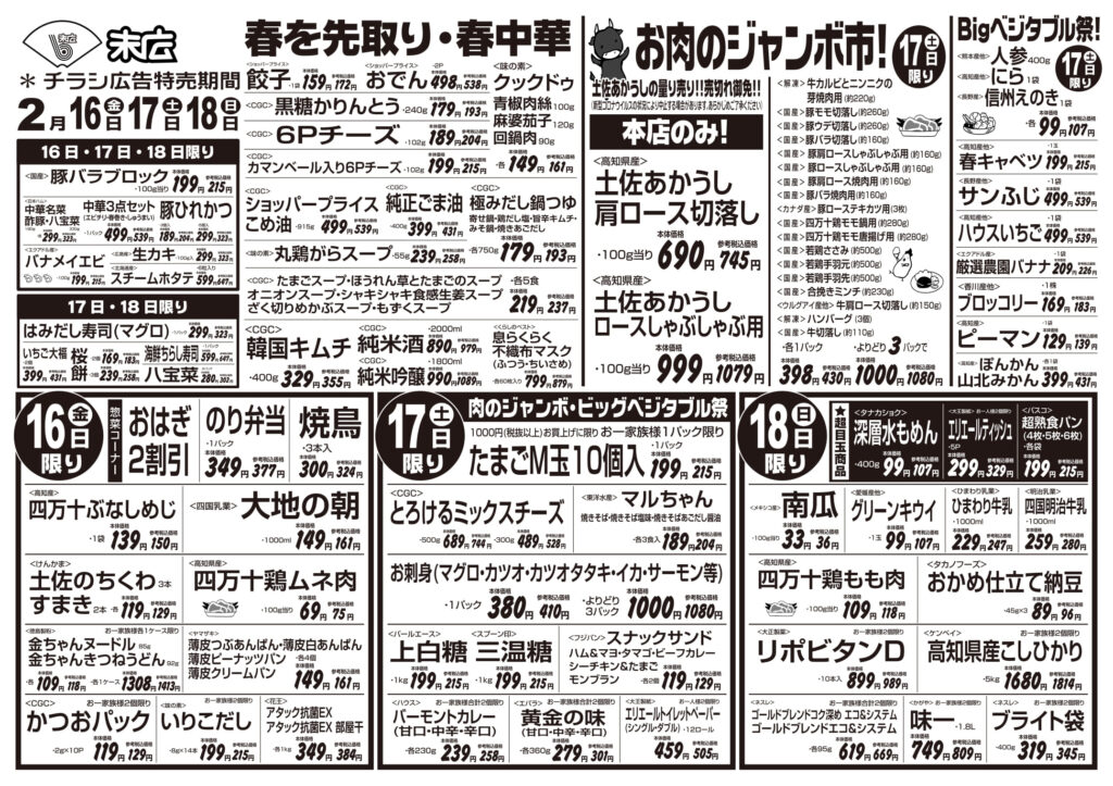 【末広チラシ情報】ネットでチラシを確認できます。 2月16日~2月22日のチラシは「春を先取り・春中華 豚バラブロック 215円」 詳細版PDFはこちら(1.5MB) -