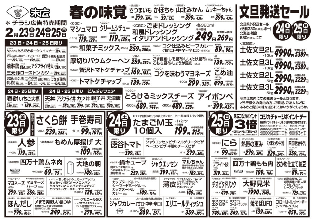 【末広チラシ情報】ネットでチラシを確認できます。 2月23日~2月29日のチラシは「春の味覚 さくら餅 258円」 詳細版PDFはこちら(1.5MB) -