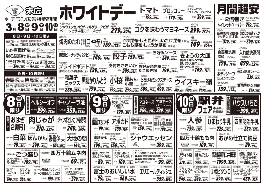 【末広チラシ情報】ネットでチラシを確認できます。 3月8日~3月14日のチラシは「ホワイトデー ハウスいちご 431円」 詳細版PDFはこちら(1.5MB) -
